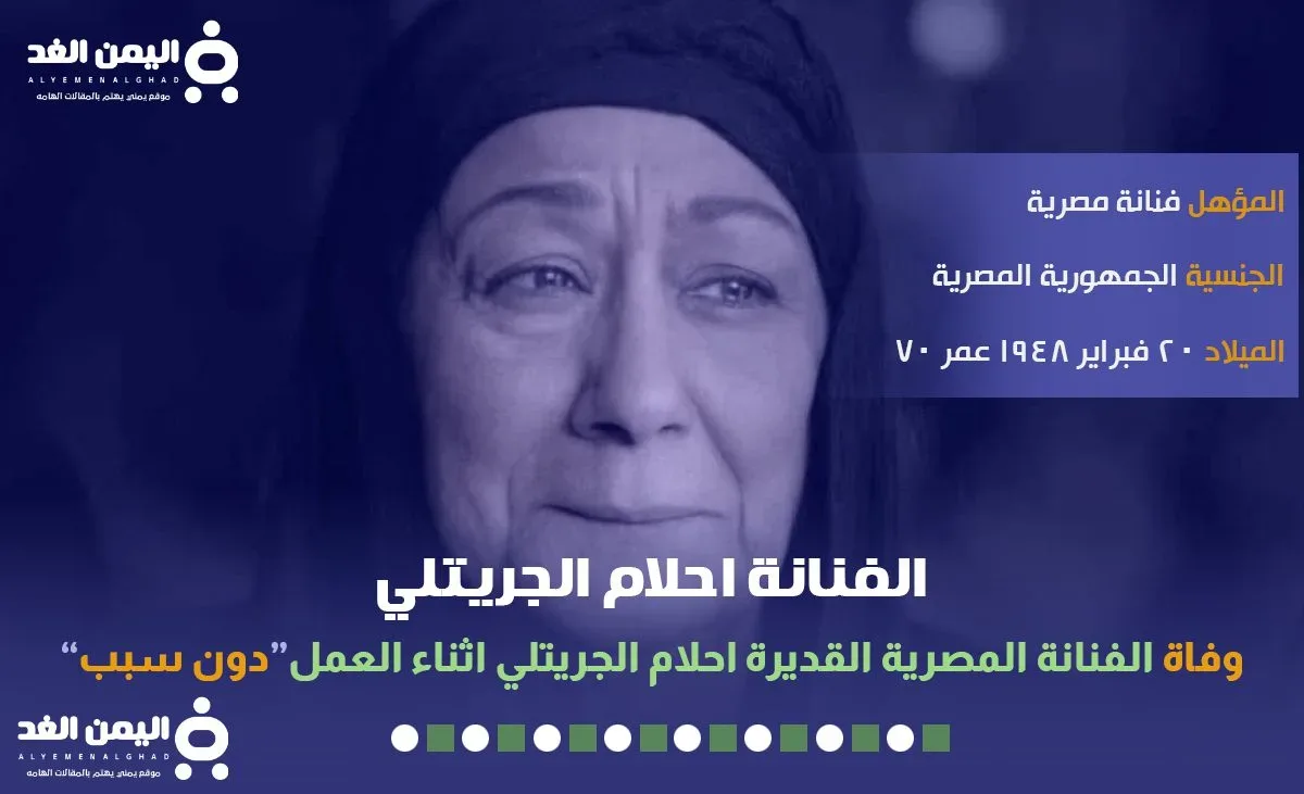 في ذكرى رحيل الفنان المصرية القديرة أحلام الجريتلي والتي توفت في السنة 28 فبراير 2021 من السنة الماضية , ونعيد لكم نشر خبر وفاة احلام الجريتلي عبر اليمن الغد وبعض التفاصيل الأخرى عن سبب وفاتها وكذلك ماهي ديانة الفنانة أحلام الجريتلي.