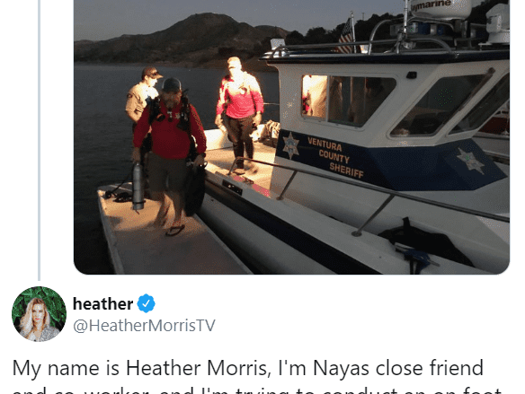 و أكدت هيذر عبر ” تويتر ” أن هي هيذر موريس و هي صديقة مقربة لنايا ريفيرا وزميلتها في العمل ، وتحاول أن تساعد في مهمة بحث وإنقاذ ريفيرا مع مجموعة صغيرة من الأصدقاء في بحيرة بيرو و استكملت كلامها قائلة: “أتفهم أن فريقك يقوم بكل ما في وسعه ، لكننا نشعر بالعجز والضعف ونريد المساعدة بأي شكل ” .