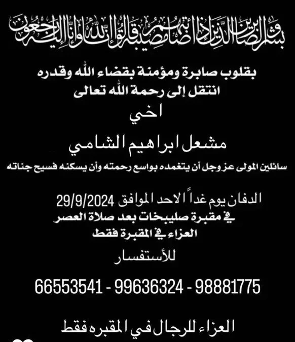 وسيتم تشييع جنازة مشعل الشامي اليوم الأحد 29 سبتمبر 2024.