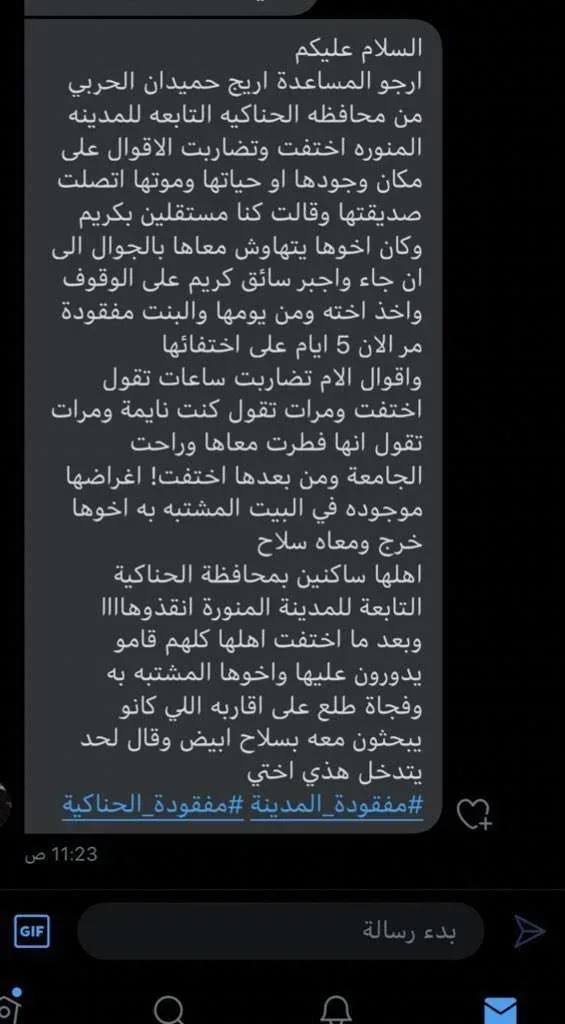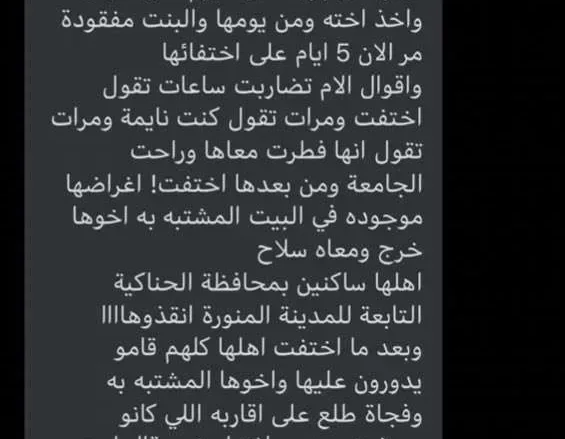 ماهي قصة اختفاء اريج حميدان الحربي مفقودة الحناكية التي تصدرت الترند اليوم بعد نشر رسالة تتحدث عن إختفاء شابة في الحناكية بعد مشاجرة مع اخوها.