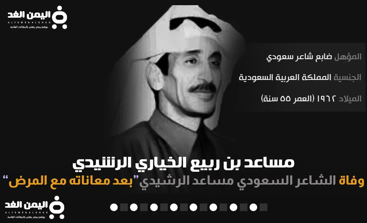 سبب وفاة الشاعر مساعد الرشيدي من هو وكم عمر الشاعر السعودي المعروف والمشهور مساعد بن ربيع الخياري الرشيدي الشاعر النبطي السعودي والضابط السعودي المعروف, ايضاً سوف نتعرف تاريخ وفاة الشاعر مساعد الرشيدي من خلال مقالنا عبر اليمن الغد نتمنى المتابعة .