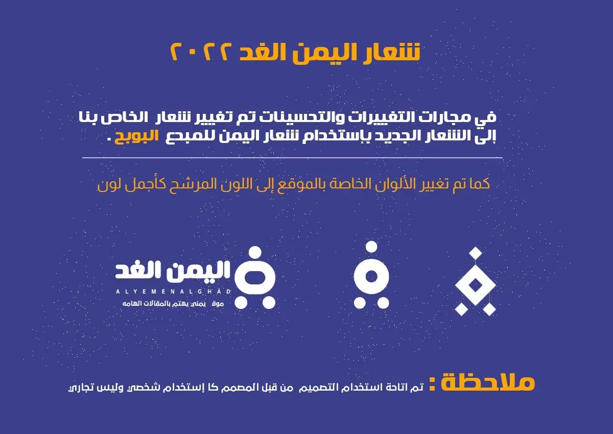 شعار اليمن الغد 2022 فكرة المصمم البوبح albobah واللون المرشح لأفضل لون :໐· حيث تم الإعتماد على الشعار الجديد بإضافة فكرة المصمم الرائع والشاب المصمم البوبح.