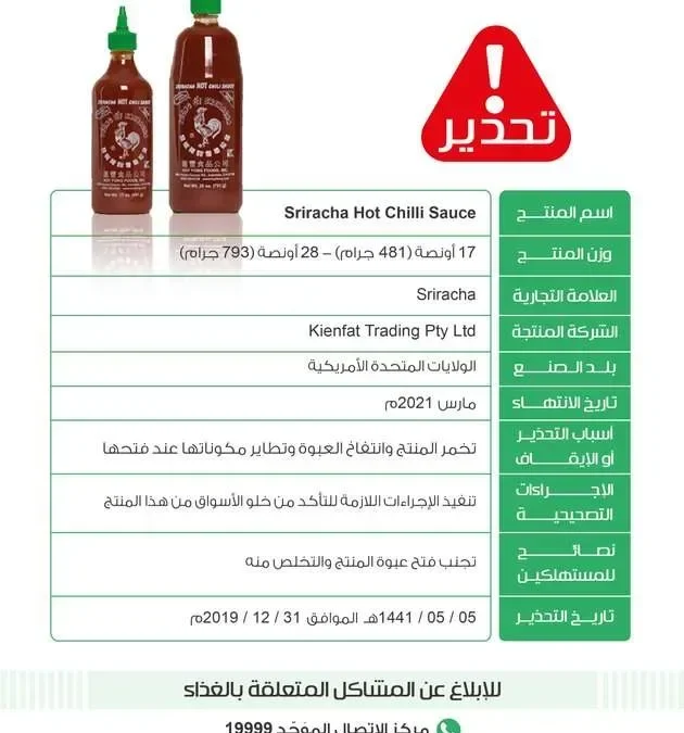 حذرت الغذاء والدواء في المملكة العربية السعودية من استعمال الصلصلة Sriracha Hot Chilli Sauce حيث تسبب في انتفاخ وتخمير المنتج.