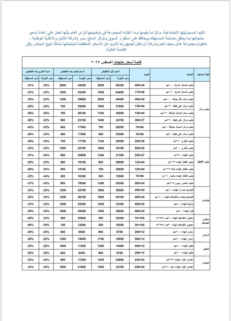 المنتجات التي شملها التخفيض تنوعت بين حليب مجفف، حليب UHT، شاي، عصائر، دقيق، وبقوليات.
