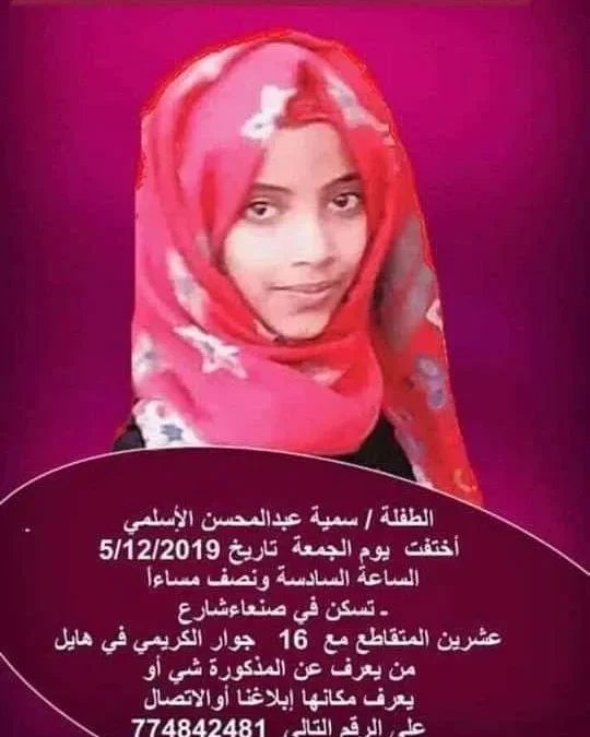 اختفاء طفلة في احد احياء العاصمة اليمنية صنعاء في ظروف غامضة ولم يتم التعرف على سبب اختفاء الطفلة سمية عبدالمحسن الأسلمي يوم الجمعة الماضية من الشهر الحالي.