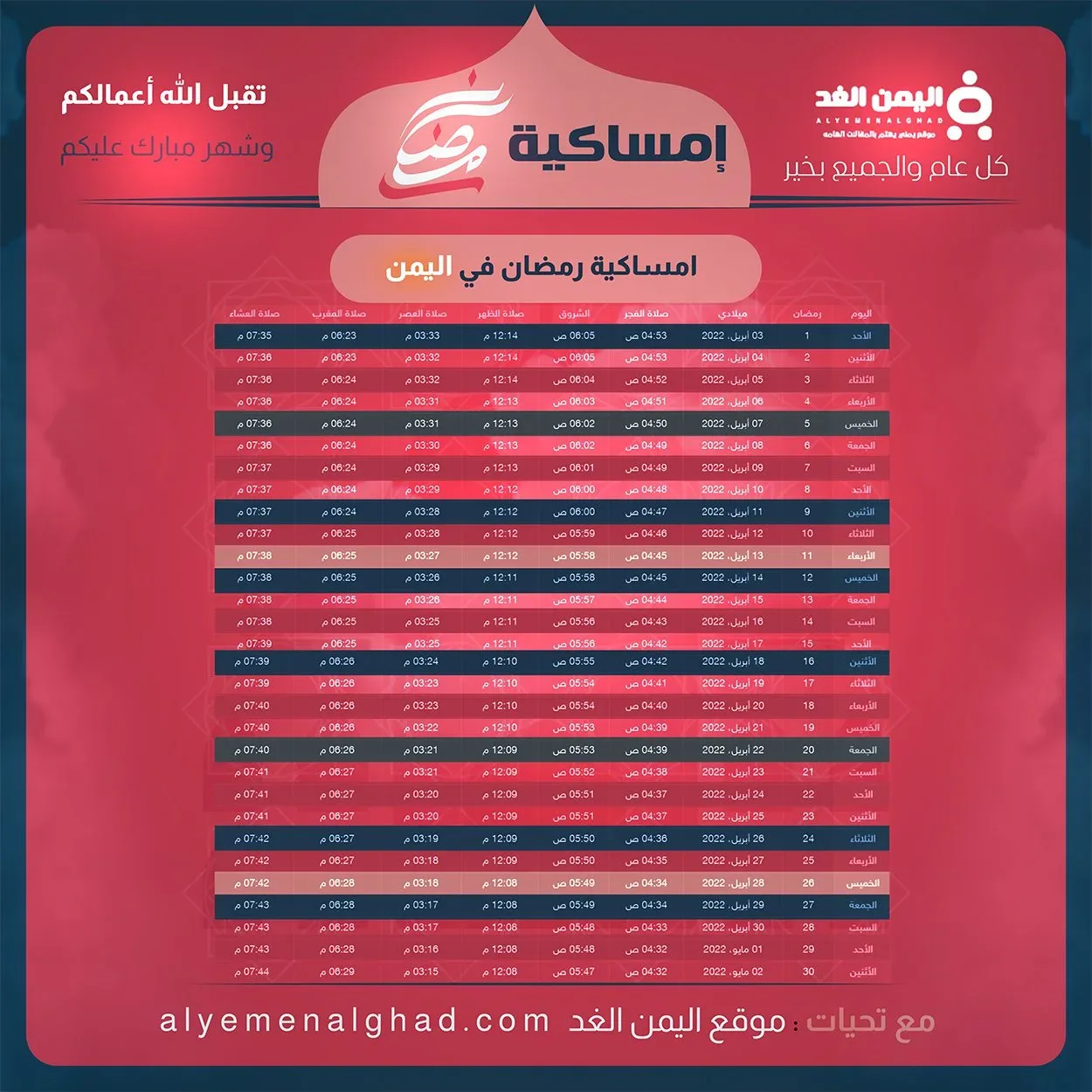 امساكية رمضان اليمن 2022 صنعاء موعد اذان المغرب 5 رمضان 1443