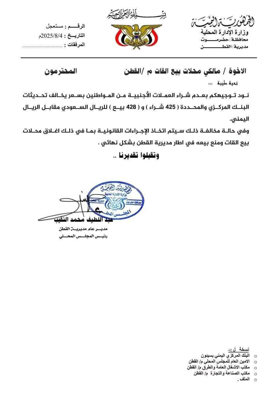 وشددت السلطة المحلية في مديرية القطن، على ضرورة الالتزام بتسعيرة البنك المركزي والمحددة (425 شراء) و(428 بيع) للريال السعودي مقابل الريال اليمني.