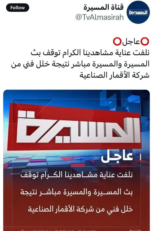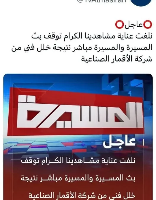 توقف بشكل مفاجيء البث الحي لـ قناة المسيرة التابعة لـ الحوثيين في صنعاء, وجاء ذلك من خلال توضيح القناة عبر صفحاتها عبر منصات التواصل الإجتماعي فيس بوك , اكس وغيرها من المواقع.