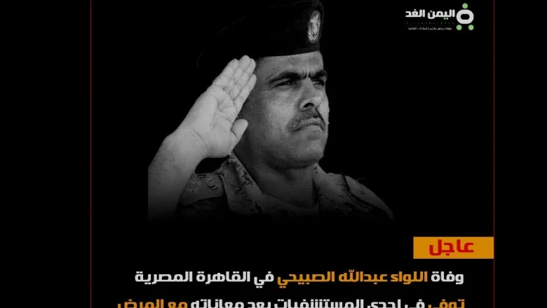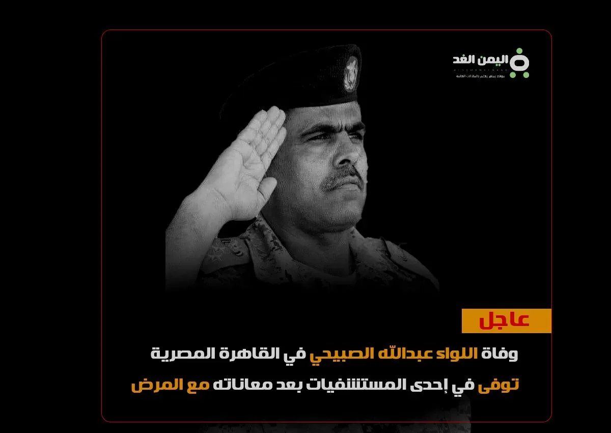 في مدينة القاهرة المصرية وفاة اللواء عبدالله الصبيحي قائد محور أبين وقائد معركة السهم الذهبي في عدن بعد معاناة مع المرض .