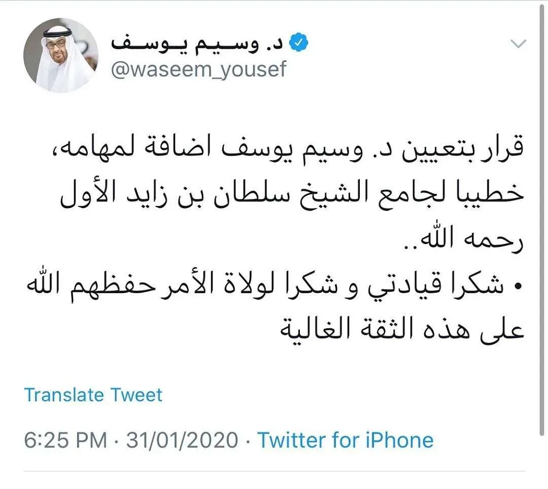 مركز جامع الشيخ زايد الكبير يعلن أنه بعد أن تم تكليف وسيم يوسف خطيباً لجامع الشيخ سلطان بن زايد الأول فإنه لم يعد بعد الآن إماما وخطيباً لمركز جامع الشيخ زايد الكبير. pic.twitter.com/Qq18TiYTv7