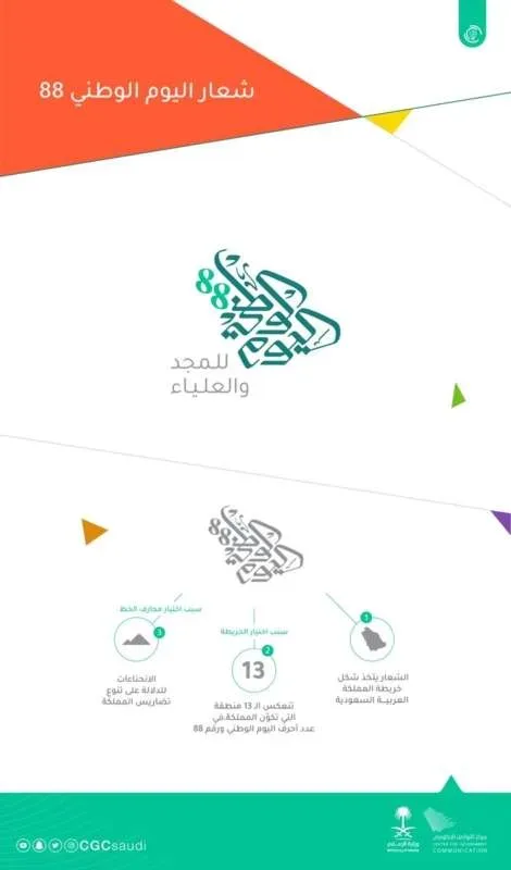 تم إطلاق الشعار الخاص بالإحتفالية بمناسبة اليوم الوطني السعودي 88 والذي تم تجهيزة وتم اطلاقة عن طريق مركز التواصل الحكومي بعد قيام العديد من الشباب في المشاركة في تصميم الشعار الخاص باليوم الوطني السعودي 88.