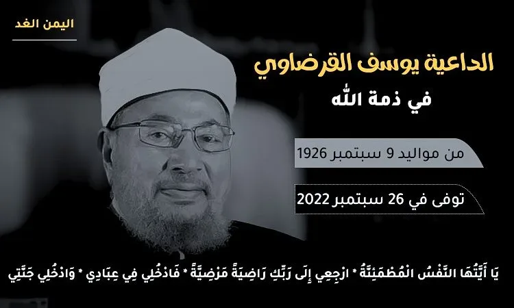 بعد الإعلان الرسمي من قبل حساب الداعية المفكر الدكتور يوسف القرضاوي عبر تويتر عن وفاة يوسف القرضاوي بعد صراع طويل مع المرض, وتوفى الشيخ القرضاوي عن عمر ناهز 96 عام , وهو من مواليد سبتمبر 1926 وتوفي يوم الإثنين 26 سبتمبر 2022.