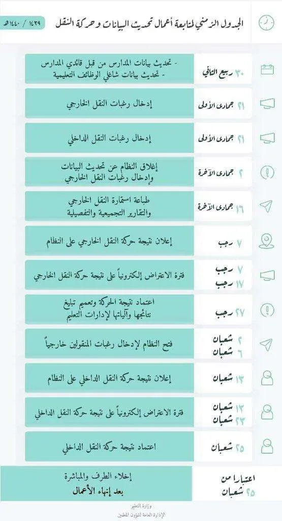 وبحسب العد التنازلي الذي قدمته الإدارة العامة لشؤون المعلمين، تبقى تقريبًا ساعات فقط على صدور نتيجة حركة النقل الخارجي 1440هـ.