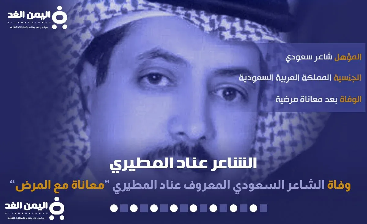توفى الشاعر السعودي عناد المطيري وذلك بعد معاناته لفترة طويلة مع المرض , وكانت هناك العديد من التعازي حول وفاة الشاعر السعودي عناد المطيري الذي توفى يوم امس.
