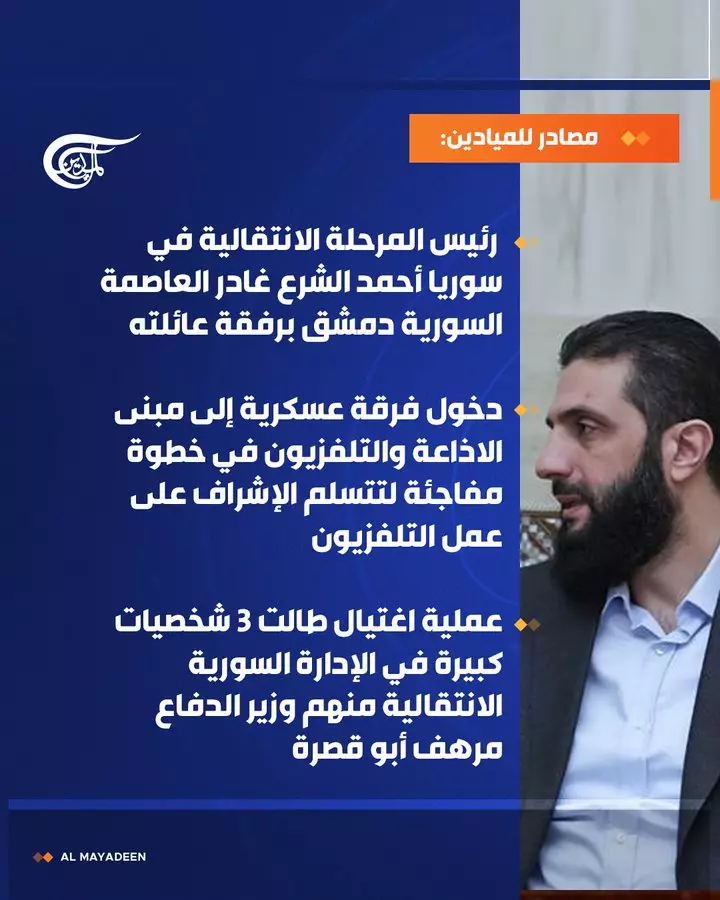 ذكرت قناة الميادين عبر حسابها على اكس عن خروج أحمد الشرع رئيس سوريا الحالي, وذلك بعد الضربات خلال الأيام الماضية من قبل الطيران الإسرائيلي, وكذلك بسبب المواجهات في السويداء والبدء في الزحف إلى دمش.