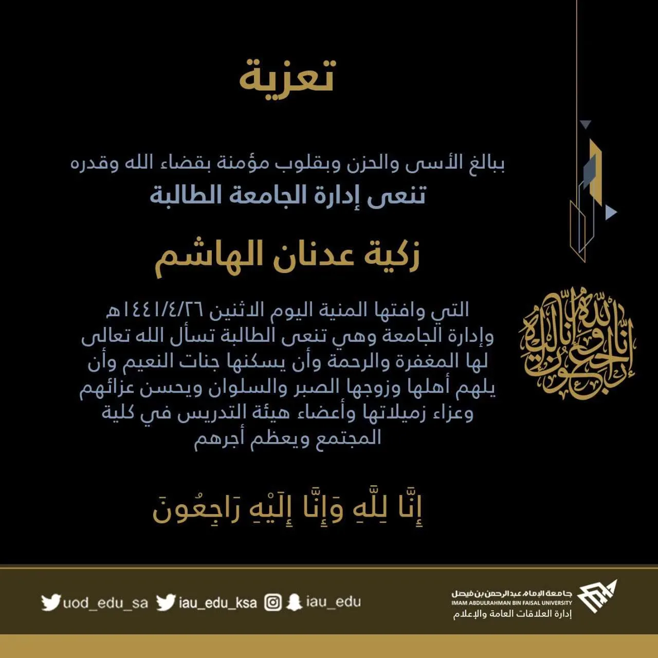 الطالبة السعودية زكية الهاشم والتي توفت يوم امس الإثنين 23 ديسمبر 2019 وذلك في الحرم الجامعي وأثناء ذهابها لأداء إختبارها النهائي في جدول الإمتحانات الخاصة بها.