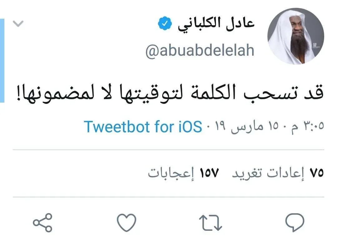 وغرد الكلباني عن حادث نيوزيلاندا قائلاً: “#حادث_نيوزيلاندا_الارهابي ما يخفف المصاب إلا أن القاتل ليس مسلما، فكم قتل مصلون بأيدي مسلمين”.