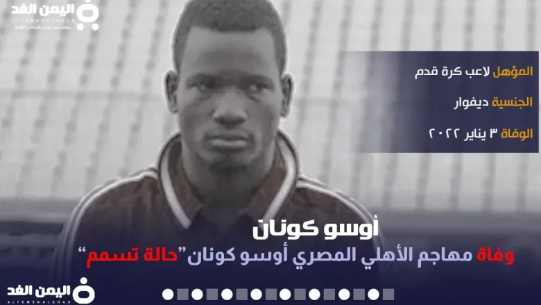 سبب وفاة أوسو كونان مقتل مهاجم الأهلي والمقاصات من هو Oussou Konan والذي توفى إثر تعرضه لتسمم وتوفى على إثر التسمم , ومن خلال المقال سوف نتعرف على بعض المعلومات التي تم التبين منها خلال الساعات الماضية إلى هذه اللحظة عبر اليمن الغد تابعونا.